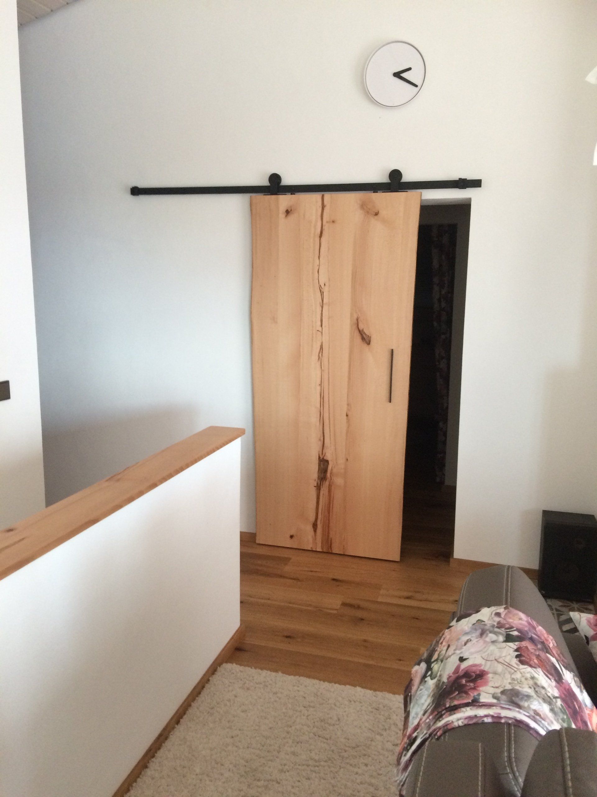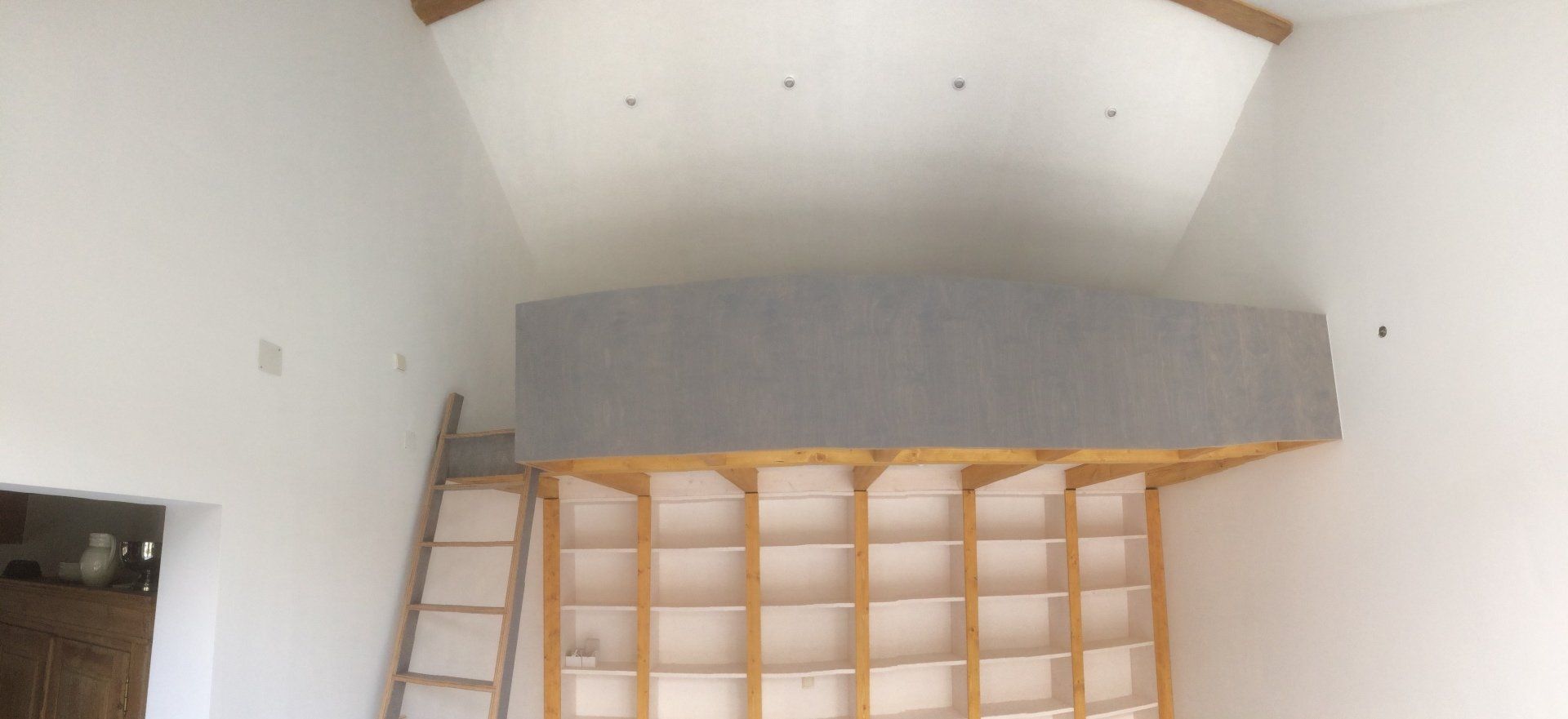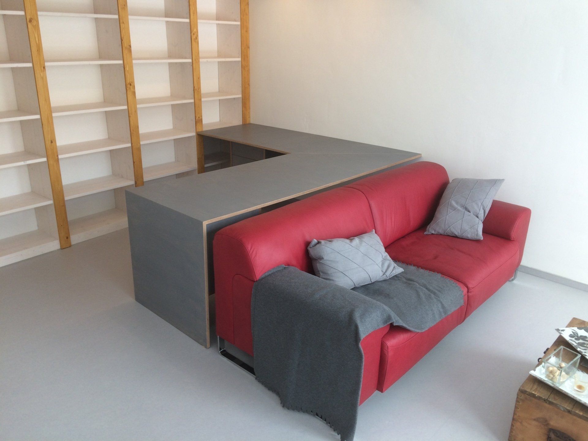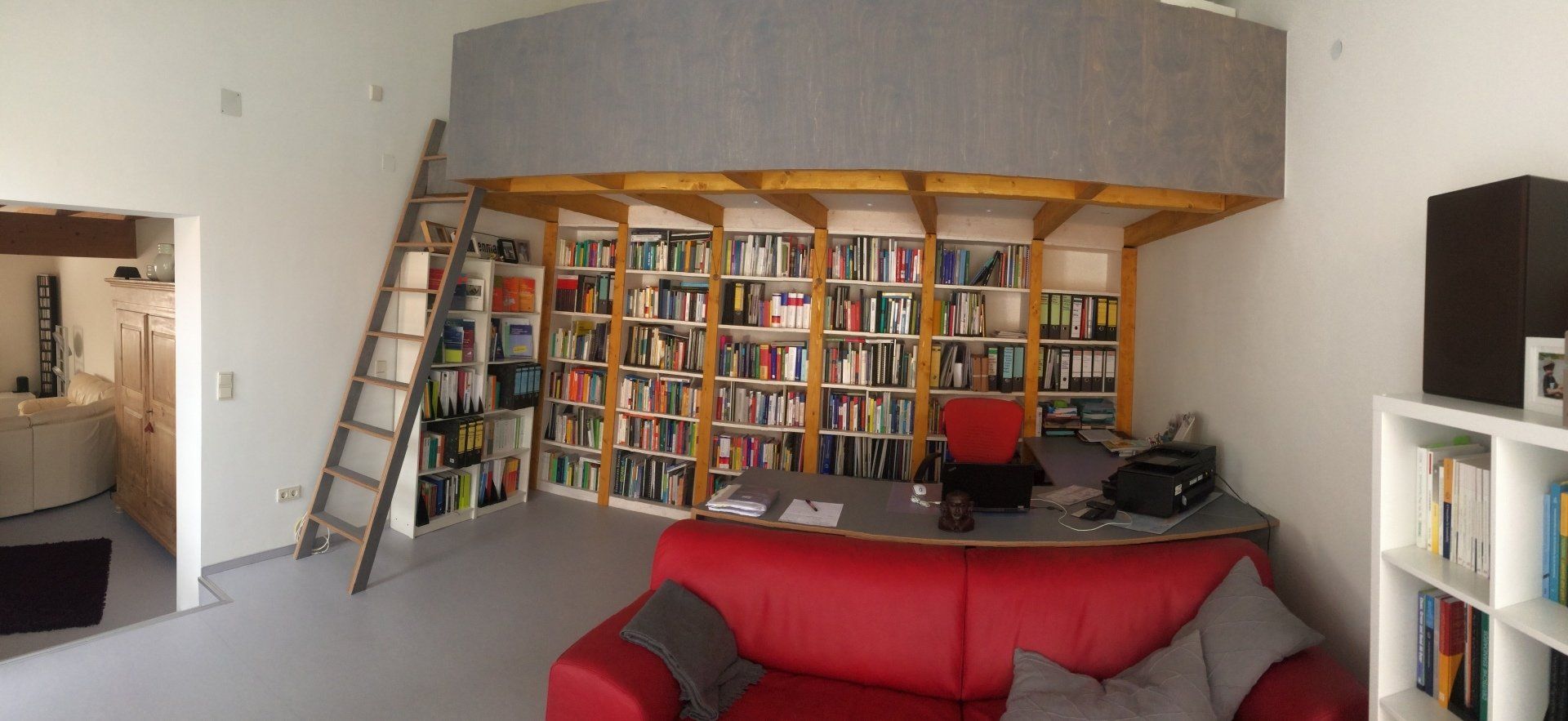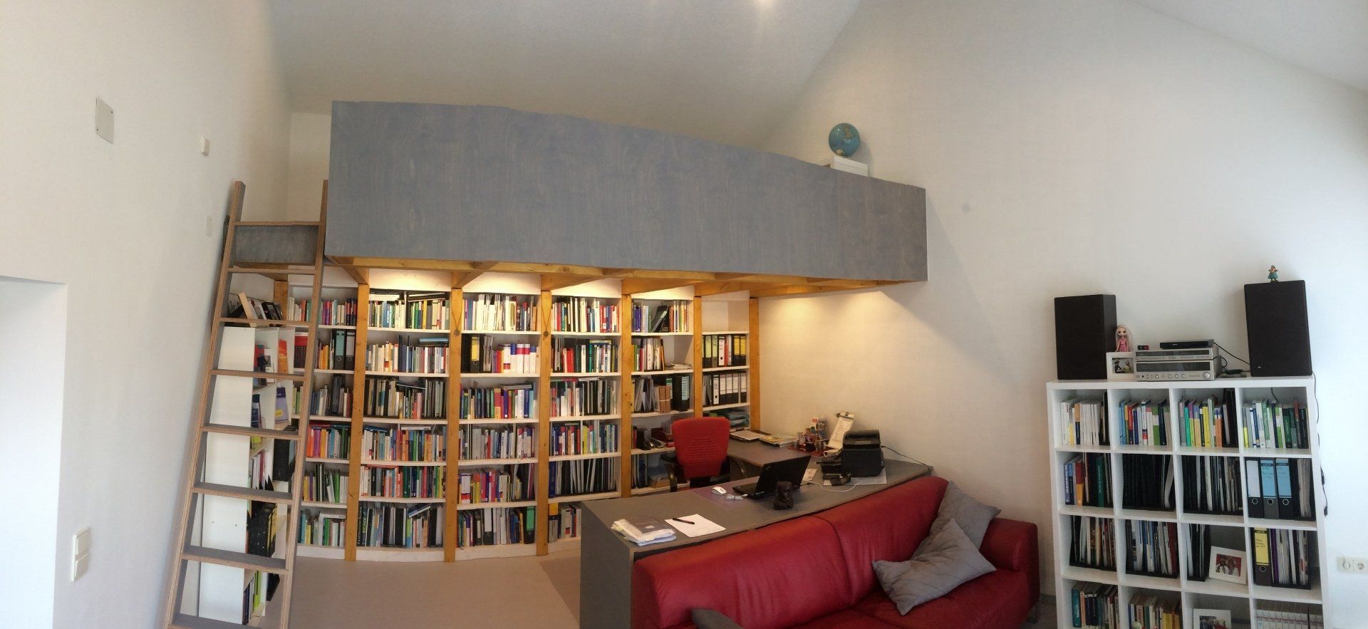 Bodenbelag, Leiter und Brüstung sowie der Schreibtisch aus Birke-Mutliplex Grau geölt,